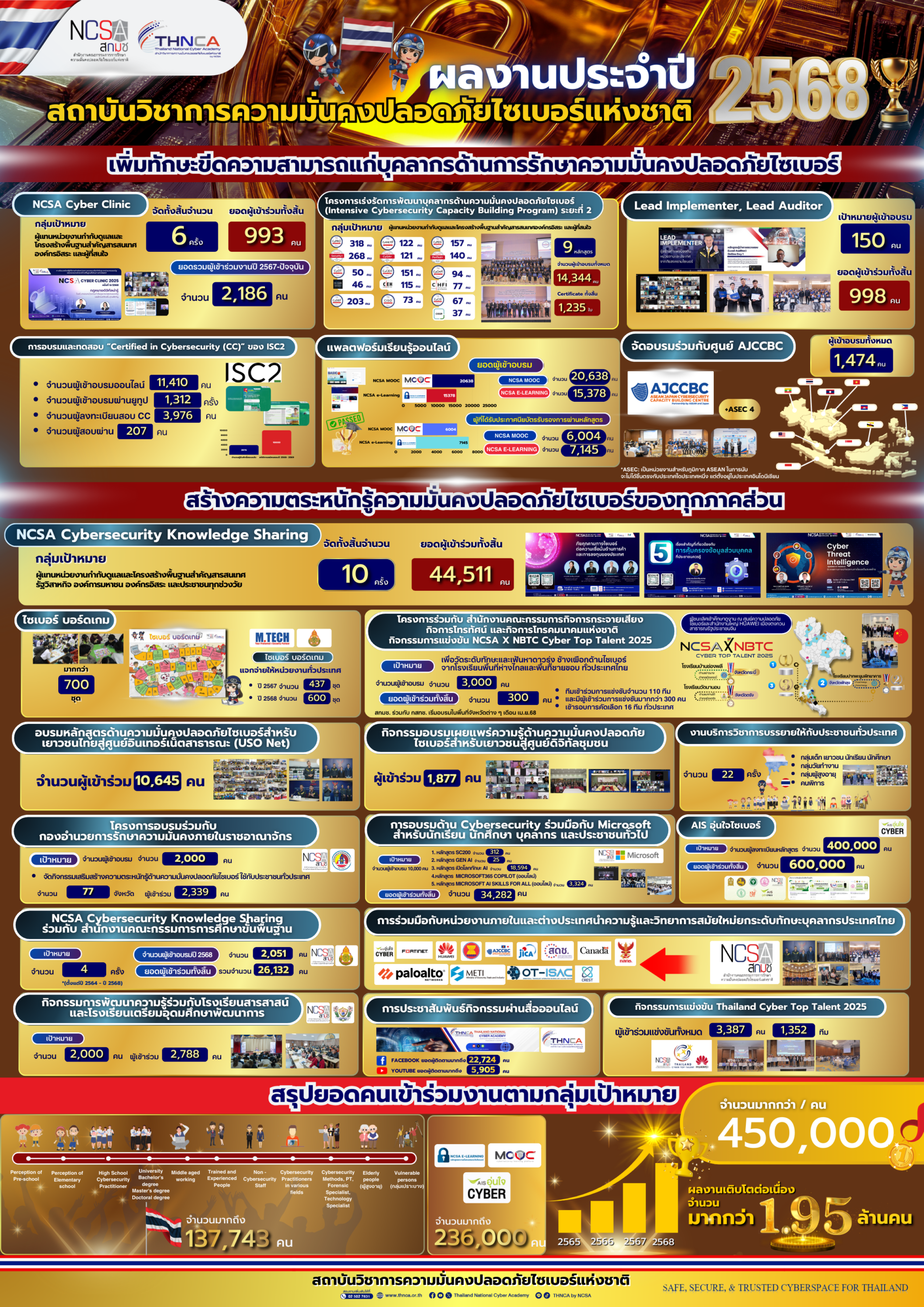 สถาบันวิชาการความมั่นคงปลอดภัยไซเบอร์แห่งชาติ (Thailand National Cyber Security Academy : THNCA) ภายใต้สำนักงานคณะกรรมการการรักษาความมั่นคงปลอดภัยไซเบอร์แห่งชาติ (สกมช.)กางแผนที่ความสำเร็จปี 2568 เผยยอดการเข้าถึงและพัฒนาศักยภาพคนไทยด้านไซเบอร์เติบโตอย่างก้าวกระโดดกว่า 1.95 ล้านคน พร้อมเดินหน้ายุทธศาสตร์เชิงรุก “สร้างความตระหนักรู้-พัฒนาผู้เชี่ยวชาญ-ขยายเครือข่าย” มุ่งเป้าขับเคลื่อนประเทศไทยสู่ “SAFE, SECURE, & TRUSTED CYBERSPACE FOR THAILAND”