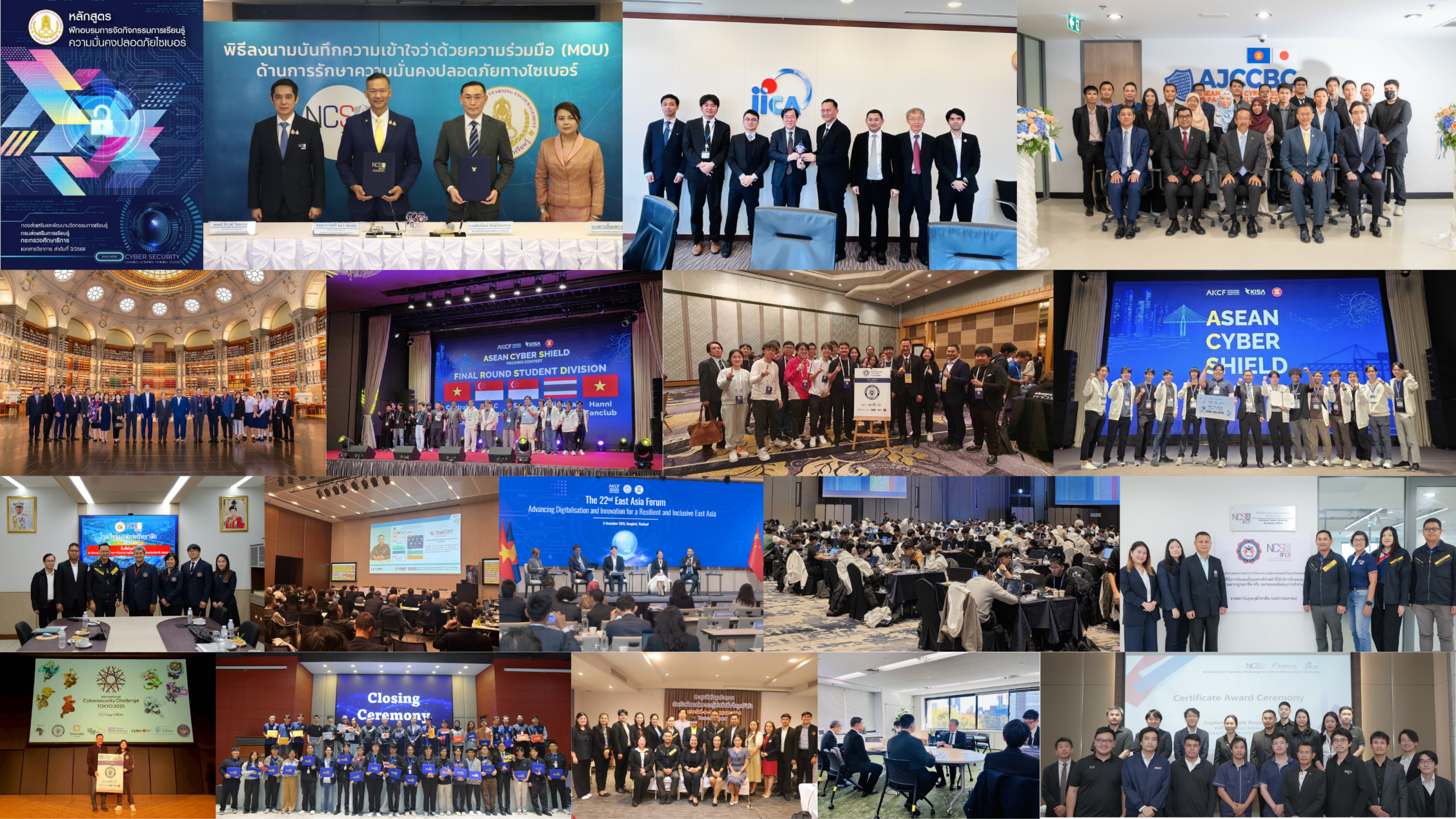 – การเป็นเจ้าภาพแข่งขัน Cyber SEA Game 2025 ร่วมกับศูนย์ ASEAN-Japan Cybersecurity Capacity Building Centre (AJCCBC) โดยมีทีมเยาวชนจากประเทศสมาชิกอาเซียน 9 ประเทศเข้าร่วม ตัวแทนประเทศไทยมาจากผู้ชนะการแข่งขัน Thailand Cyber Top Talent 2025 ทั้งนี้ยัง ได้คัดเลือกรายชื่อเยาวชนที่มีผลงานโดดเด่นจัดตั้ง “Team ASEAN” เพื่อเป็นตัวแทนภูมิภาคเข้าร่วมการแข่งขัน International Cybersecurity Challenge Competition (ICC) 2025 ที่ประเทศญี่ปุ่น