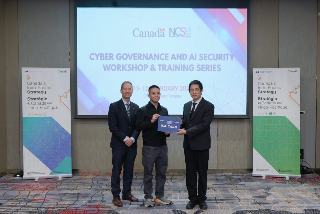 สำนักงานคณะกรรมการการรักษาความมั่นคงปลอดภัยไซเบอร์แห่งชาติ (สกมช.) ร่วมกับสถานเอกอัครราชทูตแคนาดาประจำประเทศไทย จัดอบรมหลักสูตร “Cyber Governance and AI Security Workshop & Training Series” ระหว่างวันที่ 11 – 12 กุมภาพันธ์ 2569 เวลา 08.30 – 17.00 น. ณ ห้อง KO MES 2 ชั้น 1 โรงแรมชาเทรียม แกรนด์ กรุงเทพฯ เพื่อเสริมสร้างองค์ความรู้ด้านธรรมาภิบาลไซเบอร์ (Cyber Governance) และความมั่นคงปลอดภัยของปัญญาประดิษฐ์ (AI Security) แก่ผู้บริหารและผู้แทนหน่วยงานสำคัญของประเทศ