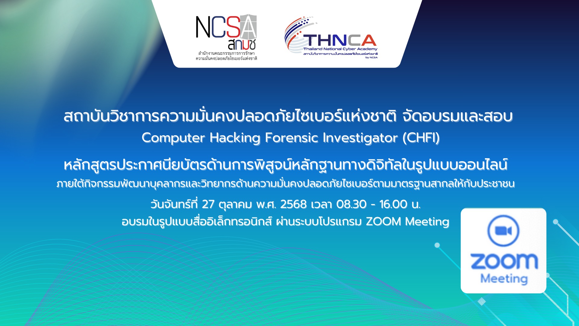 วันนี้ (27 ต.ค. 68) สถาบันวิชาการความมั่นคงปลอดภัยไซเบอร์แห่งชาติ สกมช. เปิดอบรม “หลักสูตรประกาศนียบัตรด้านการพิสูจน์หลักฐานทางดิจิทัล” ในรูปแบบออนไลน์ ภายใต้กิจกรรมพัฒนาบุคลากรและวิทยากรด้านความมั่นคงปลอดภัยไซเบอร์ตามมาตรฐานสากลให้กับประชาชน ซึ่งจัดขึ้นระหว่างวันที่ 27 – 31 ต.ค. 2568 โดยมีผู้เข้าร่วมอบรมจากหลายหน่วยงานทั่วประเทศมากกว่า 650 คน เพื่อเตรียมความพร้อมสำหรับสอบใบรับรองมาตรฐานสากล CHFI