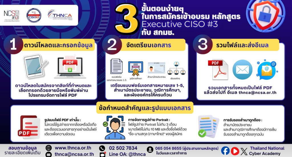 - เป็นบุคลากรของหน่วยงานกำกับดูแล (Regulator) หน่วยงานโครงสร้างพื้นฐานสำคัญทางสารสนเทศ (CII) หรือหน่วยงานของรัฐ/ภาคเอกชน ที่ดำรงตำแหน่งผู้บริหารระดับสูง