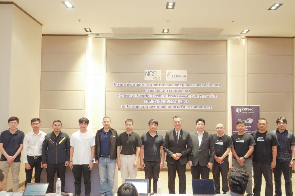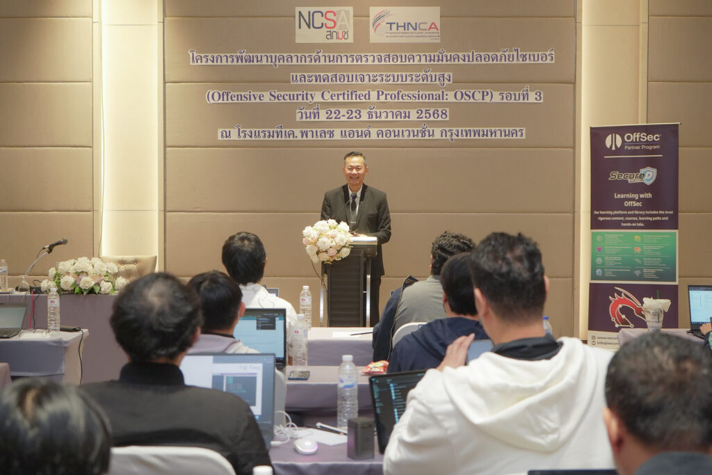 ให้เกียรติกล่าวต้อนรับและให้กำลังใจแก่ผู้เข้าอบรมหลักสูตรประกาศนียบัตรด้านการตรวจสอบความมั่นคงปลอดภัยไซเบอร์และทดสอบเจาะระบบระดับสูง(Offensive Security Certified Professional : OSCP) รูปแบบ OSCP Pre-Bootcamp จัดขึ้นภายใต้กิจกรรมพัฒนาบุคลากรด้านการตรวจสอบความมั่นคงปลอดภัยไซเบอร์และทดสอบเจาะระบบระดับสูง ระหว่างวันที่ 22–23 ธันวาคม 2568 ณ โรงแรม ทีเค.พาเลซ แอนด์ คอนเวนชั่น กรุงเทพมหานคร มีผู้ผ่านการคัดเลือกเข้าร่วมอบรมจำนวน 50 คน ประกอบด้วยเจ้าหน้าที่จากหน่วยงานกำกับหรือควบคุมดูแล (Regulator) หน่วยงานโครงสร้างพื้นฐานสำคัญทางสารสนเทศ (Critical Information Infrastructure : CII) หน่วยงานภาครัฐและภาคเอกชนที่เกี่ยวข้อง