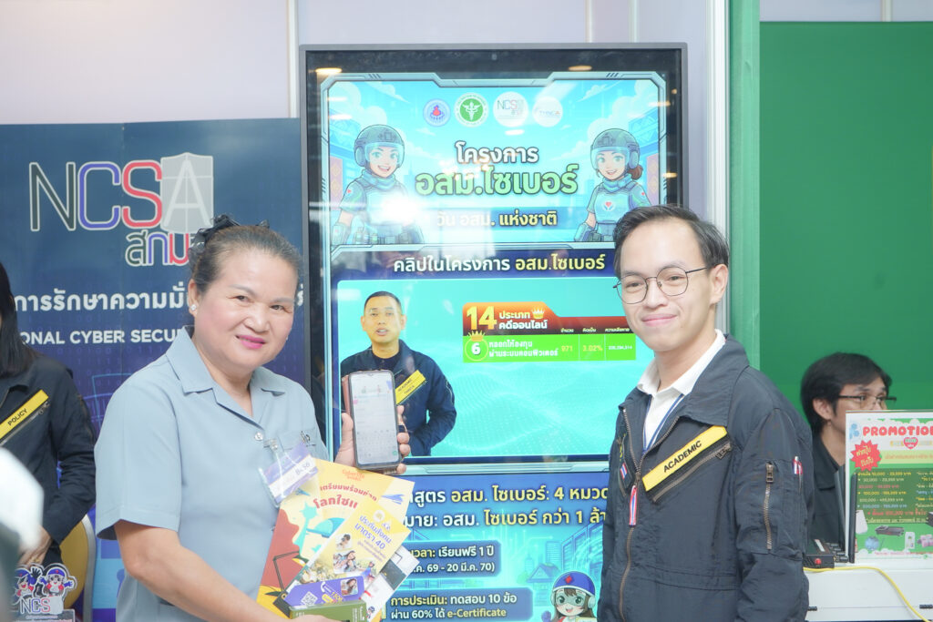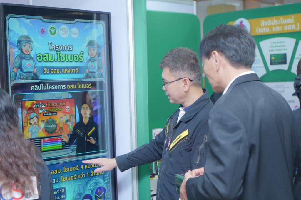 วันนี้ (20 มีนาคม 2569) สถาบันวิชาการความมั่นคงปลอดภัยไซเบอร์ สกมช. ลงพื้นที่ออกบูธร่วมงานวัน อสม. แห่งชาติ ณ รร.เอเชียแอร์พอร์ท พร้อมเปิดตัว “โครงการ อสม.ไซเบอร์” อย่างเป็นทางการ บรรยากาศภายในงานบอกเลยว่าคึกคักสุดๆ ครับ พี่น้อง อสม. ให้ความสนใจแวะเวียนมาที่บูธกันอย่างเนืองแน่น ทั้งเข้ามาร่วมฟังคำแนะนำจากทีมเจ้าหน้าที่สถาบันฯ ที่คอยประกบอธิบายข้อมูลกันแบบใกล้ชิดหน้าจอแสดงผล ทดลองสแกนคิวอาร์โค้ด และยังมีน้องมาสคอตไซเบอร์สุดน่ารักของ สกมช. มาคอยต้อนรับสร้างสีสันและรอยยิ้มให้กับทุกคนในงานด้วย