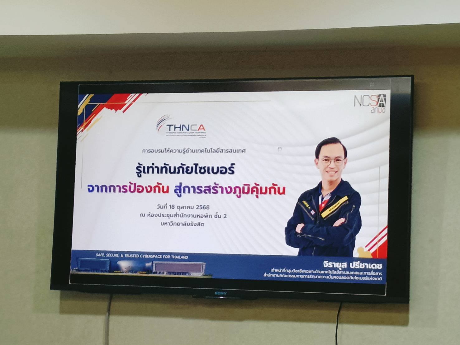 18 ตุลาคม 2568 สถาบันวิชาการความมั่นคงปลอดภัยไซเบอร์แห่งชาติ (สกมช.) ร่วมบรรยายให้ความรู้แก่นักศึกษามหาวิทยาลัยรังสิต ในหัวข้อ “รู้เท่าทันภัยไซเบอร์ จากการป้องกัน สู่การสร้างภูมิคุ้มกัน” และ “สุขภาวะดิจิทัลและการอยู่ร่วมกันในโลกดิจิทัลอย่างเข้าอกเข้าใจ” เนื่องในการอบรมให้ความรู้ด้านเทคโนโลยีสารสนเทศ
